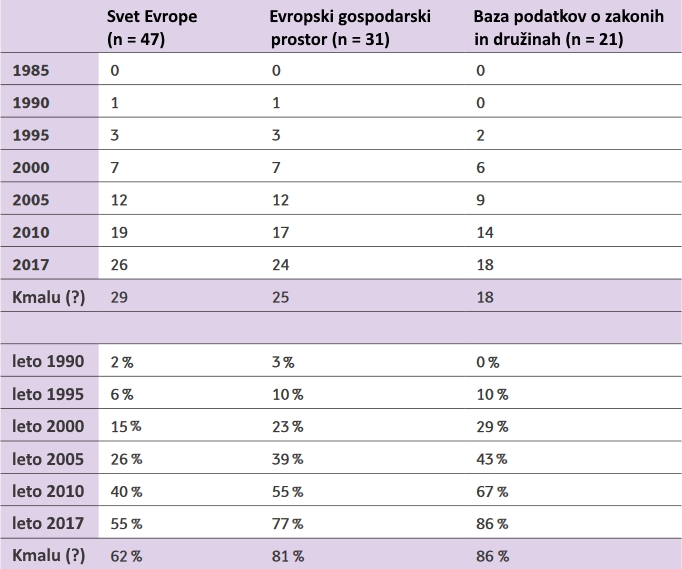 Število in odstotek držav, kjer sta zakonska zveza in/ali registrirano partnerstvo na voljo istospolnim parom na nacionalni ravni. »Kmalu« se nanaša na pričakovano sprejetje nove zakonodaje v Estoniji, Monaku in San Marinu.